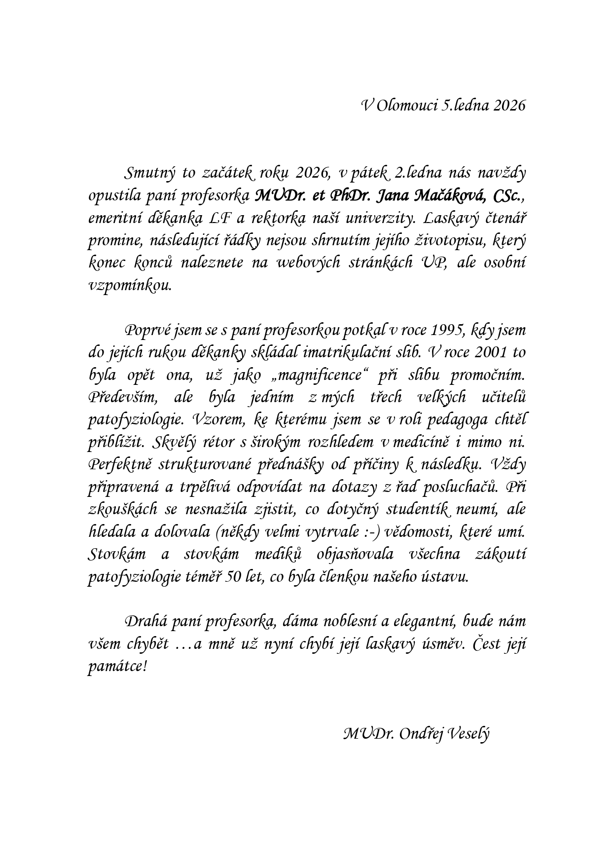 VZPOMÍNKA na paní profesorku Janu Mačákovou V souvislosti se zprávou o úmrtí dlouholeté členky Ústavu, paní prof. MUDr. PhDr. Jany Mačákové, CSc., zveřejňujeme vzpomínku odb. as. MUDr. Ondřeje Veselého.